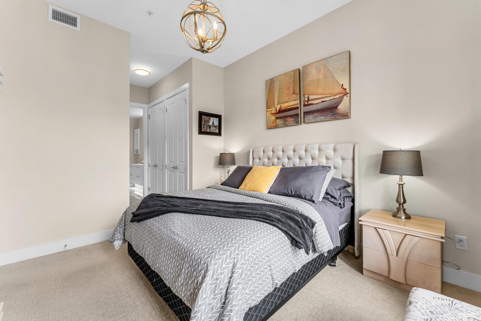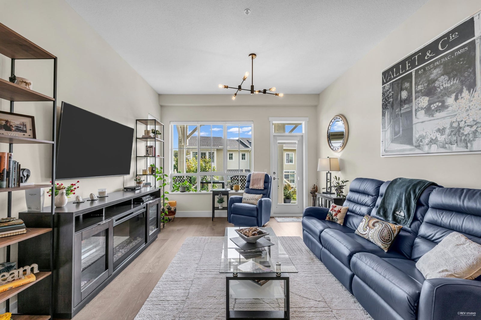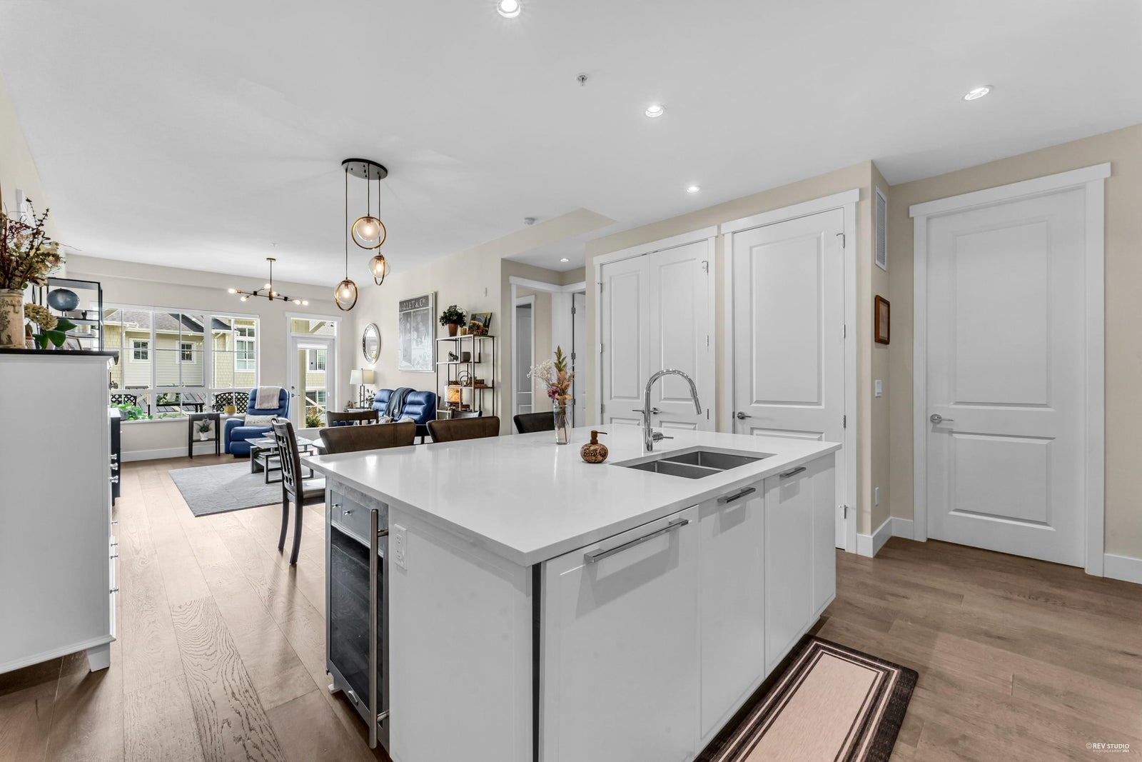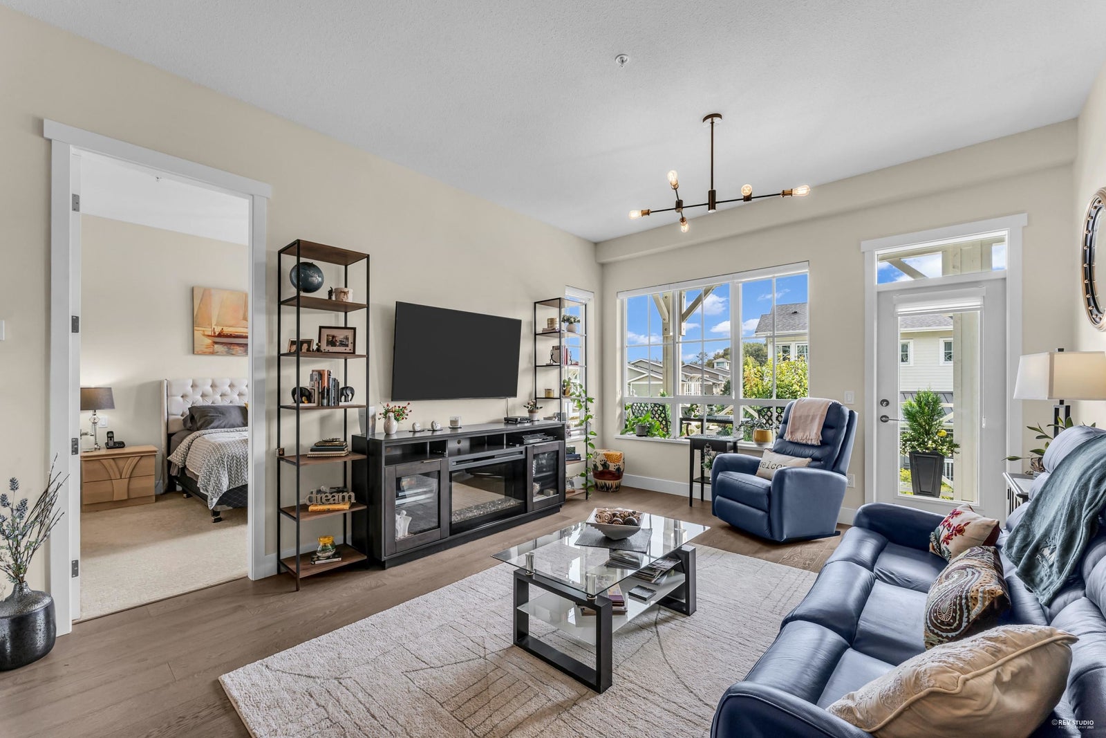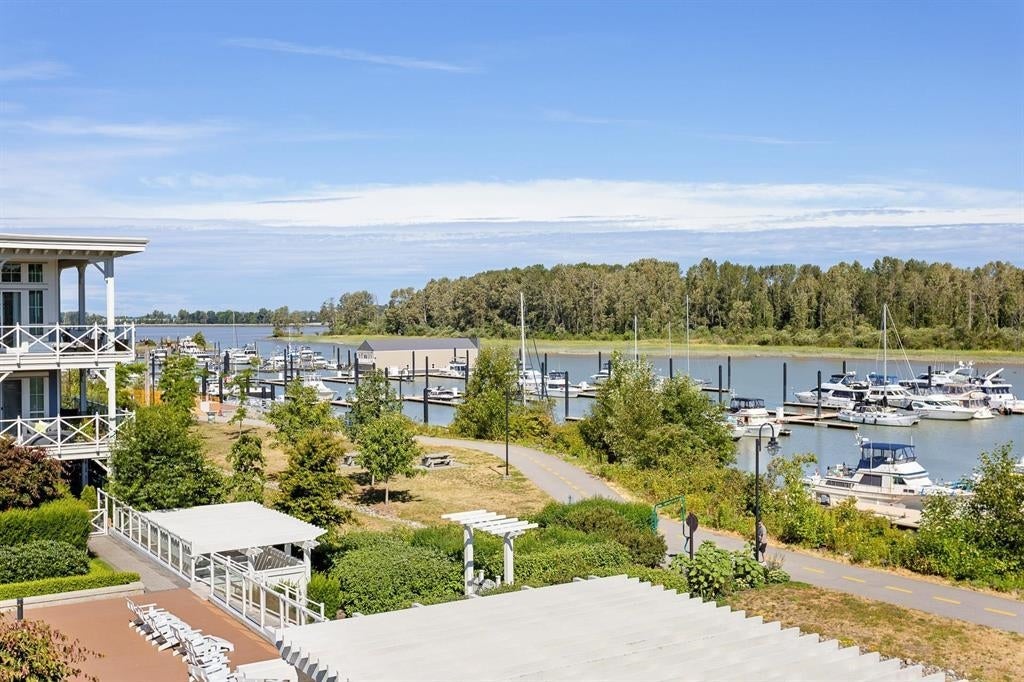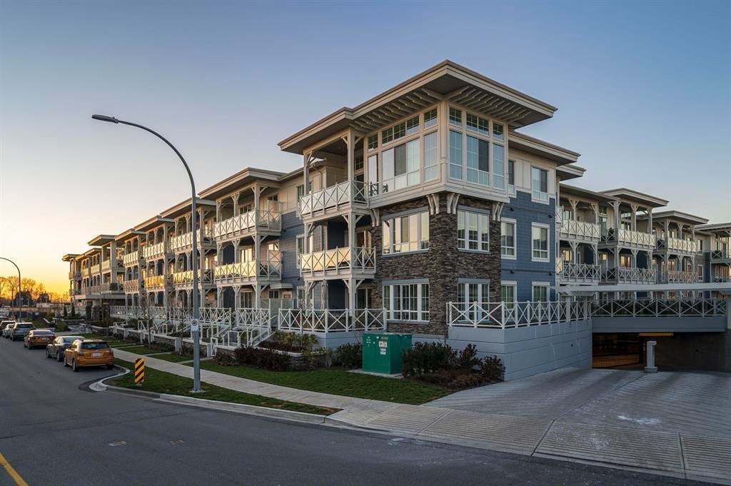 Welcome to Pilothouse by Polygon in Ladner. This boutique complex sits on the banks of Captain's Cove Marina offering serene surroundings with picturesque water views, walking trails, boat launch and more. The home offers bright open concept living with high ceilings throughout, blending functionality with custom lighting & window coverings. Gourmet kitchen with high-end ss appliances, quartz counters and oversized serving island. Master bedroom offers a walk in closet and spa-like ensuite complete with dual vanity and soaker tub. 1 parking stall (EV rough-in) near elevator and 1 private storage room located just down the hall from the unit! Access to the Hampton Club with outdoor pool/hot tub, gym, common room, and guest suite. Spacious balcony with gas BBQ hookup & tranquil marina views.