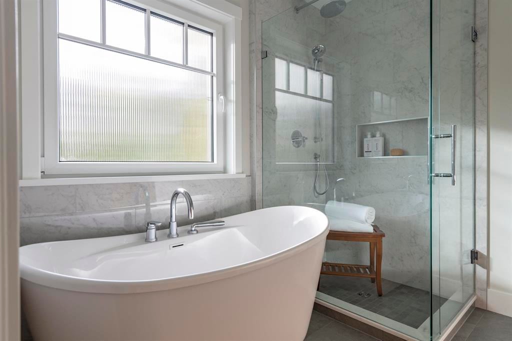spa-inspired bathrooms include quartz counters, heated floors, and elegant soaker tubs.